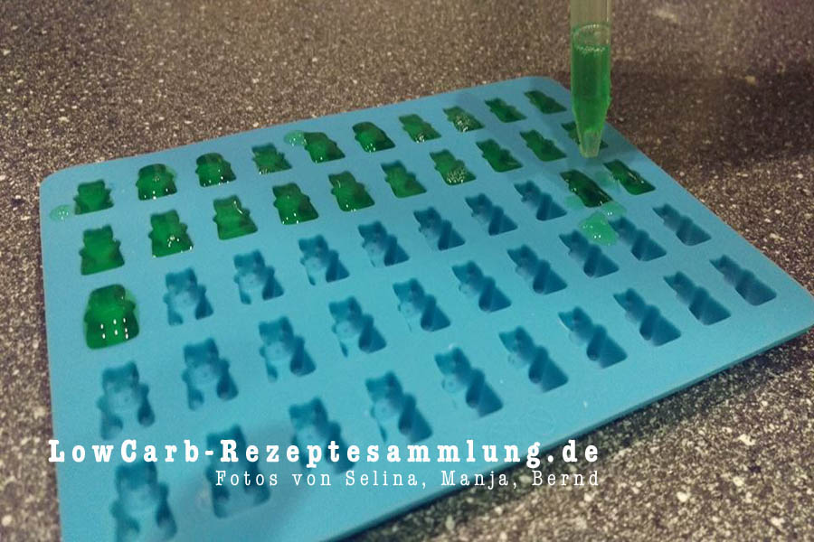 Dann sehr zügig die noch flüssige Gummibärchenmasse, mit einer Pipette in die Gummibärchenform geben und dann ca. 30 Minuten fest werden lassen.