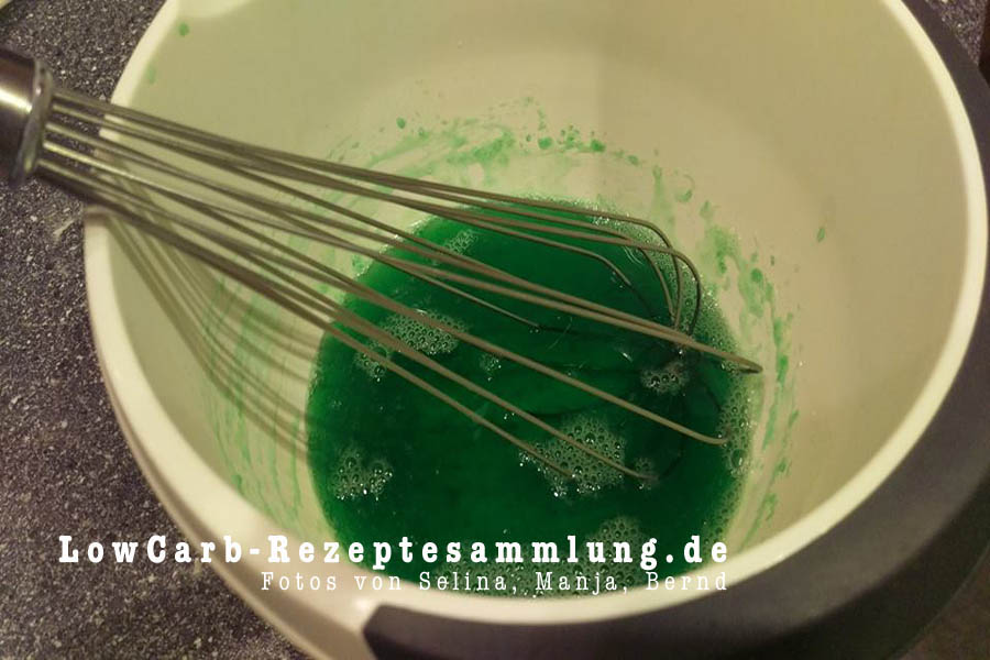 Die 100ml Wasser erhitzen (Wasserkocher, Herd, Mikrowelle) und in eine Rührschüssel geben. Das Gelantinepulver unter langsamen Rühren dazugeben und alles gut unterrühren. Das langsame rühren ist erforderlich, damit keine Blasen entstehen. Nun das Götterspeisenpulver dazugeben und auch gut verrühren. Jetzt den Xucker dazugeben und wieder vorsichtig aber zügig und gut unterrühren.